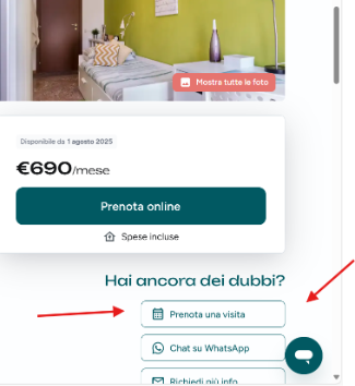 Puoi prenotare una visita direttamente dalla pagina dell’appartamento che ti interessa. Ti basta cliccare sul pulsante "Prenota visita", scegliere una data e un orario disponibili, e compilare il modulo con i tuoi dati.